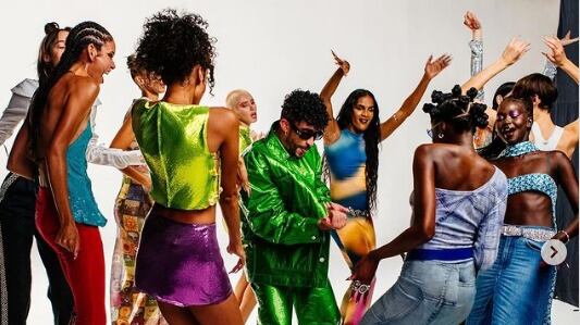 Bad Bunny aparece llevando un traje de Bottega Veneta en verde lima brillante y sus propias gafas de sol, cortesía de Louis Vuitton. Las modelos llevan conjuntos de Versace, Stella McCartney o Blumarine.