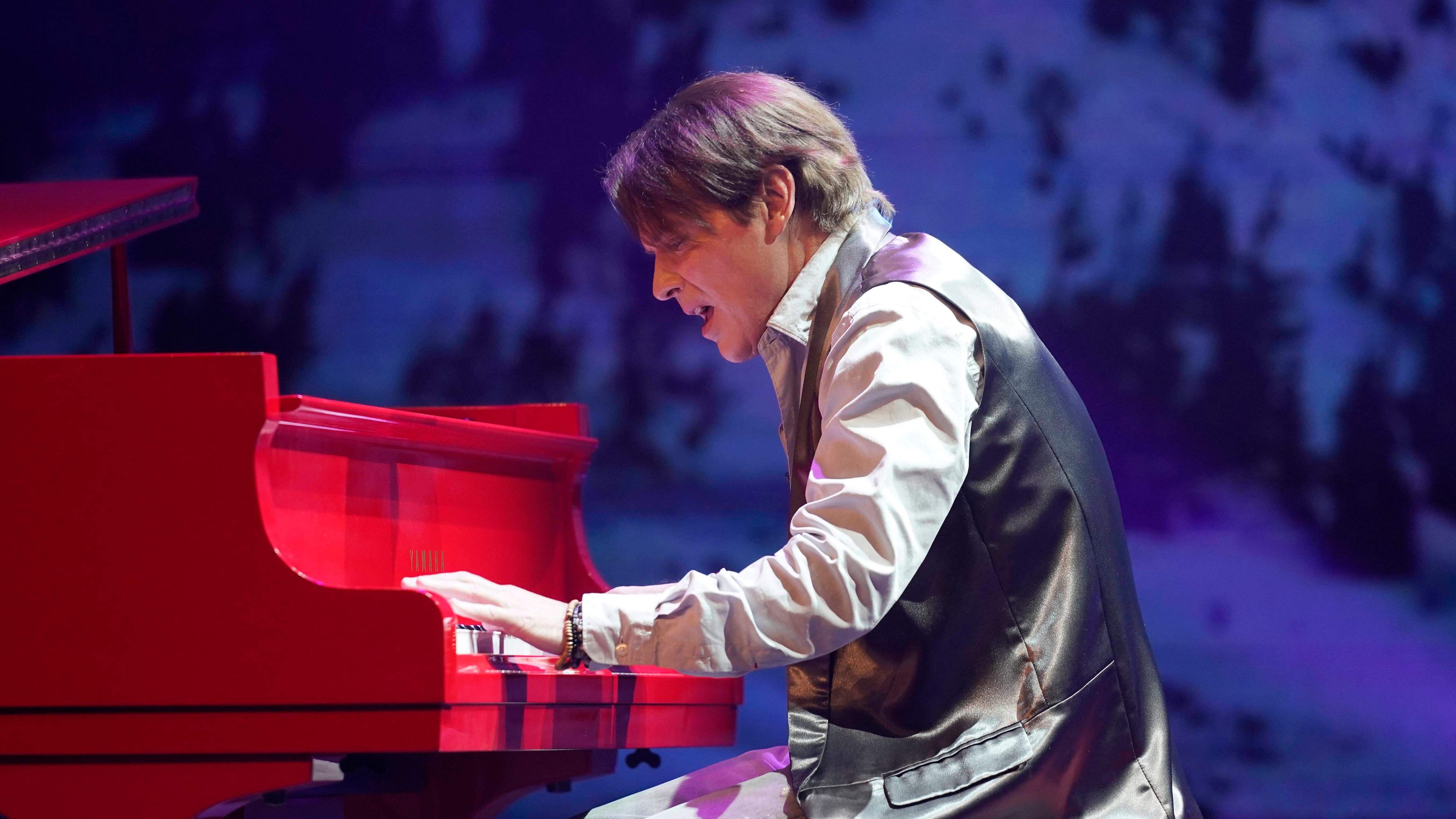 Con las manos sobre el teclado de un imponente piano rojo de cola, el artista se transporta a diferentes escenarios navideños en una pantalla gigante de fondo que los hace parecer reales, como si estuviera tocando en ese mismo lugar: pinos inmensos que giran como un carrusel con coloridas luces que titilan al compás de la música, calles con edificios y negocios decorados para la Navidad, copiosas nevadas que caen sobre una cabaña de madera, siervos que corren bajo cielos azules estrellados.