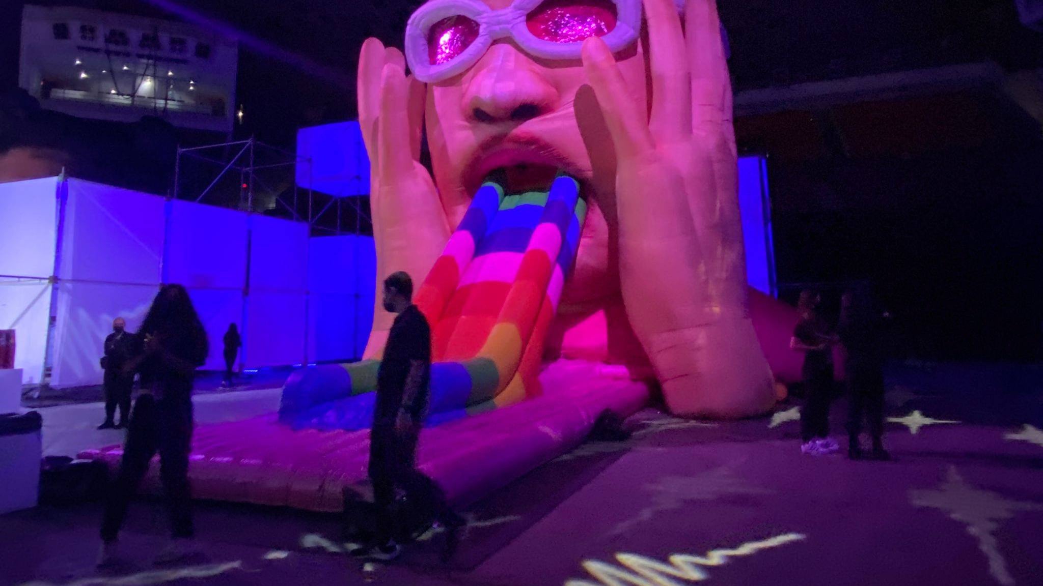 Te llevamos en imágenes a un breve recorrido por la colorida instalación donde se imponen enormes figuras del rostro del conejo malo. De igual manera, muestra el set de lo que formaron parte de los videos de sus canciones, así como unos de los diseños de sus tennis a gran escala.