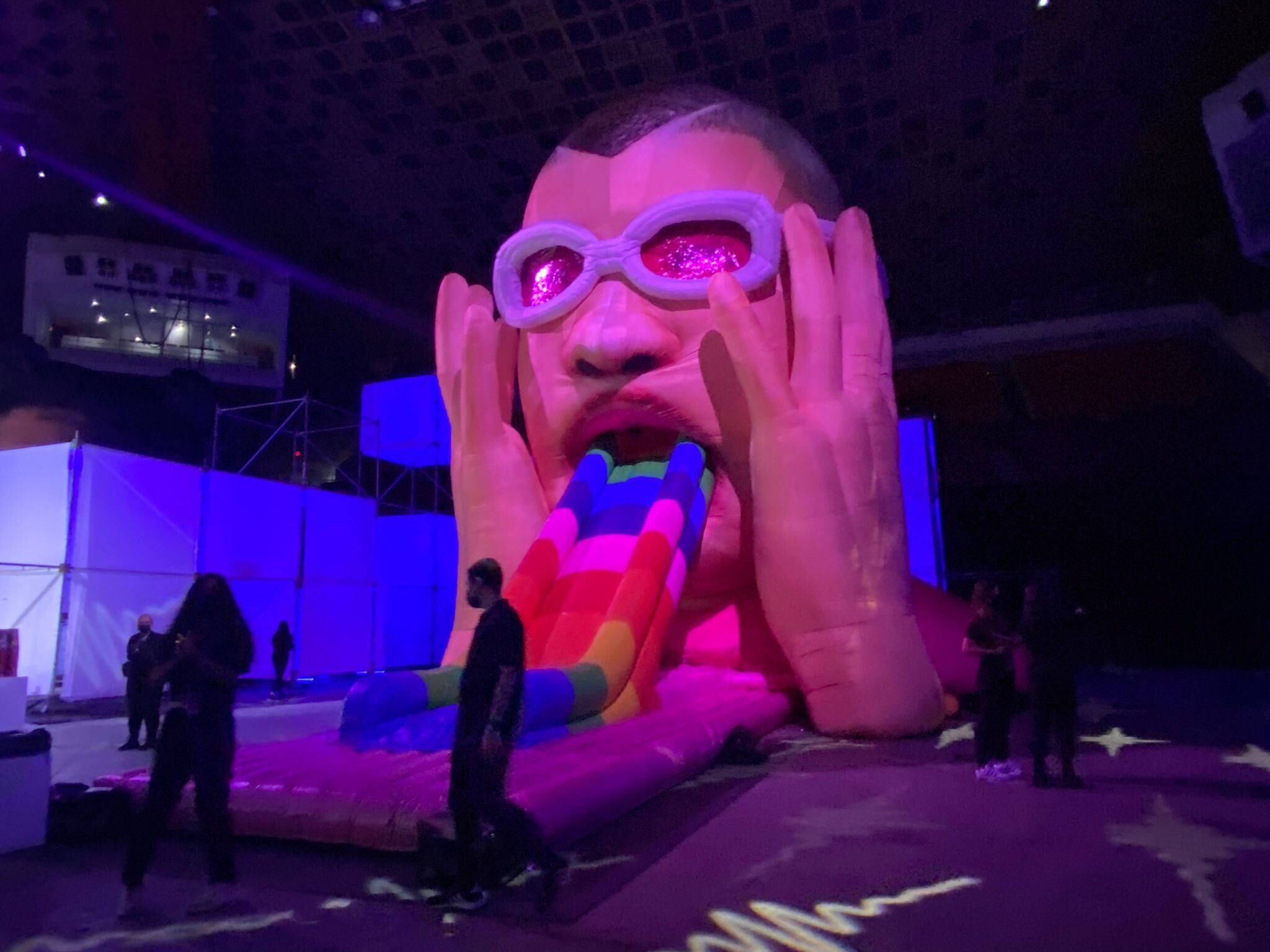 Una vez adentro, se encuentra el primer inflable gigante que simula la cabeza del artista con una chorrera en forma de arcoíris saliendo de su boca.