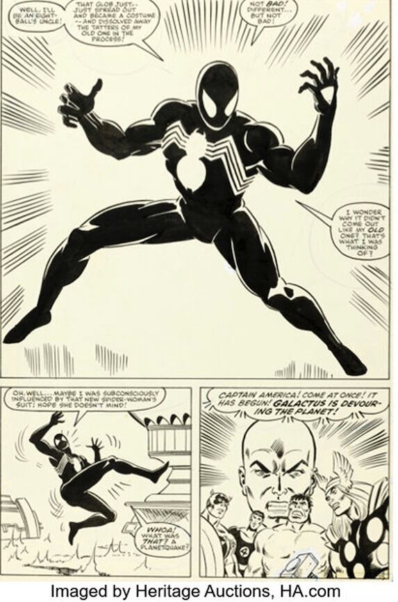 Las ilustraciones de Mike Zeck para la página 25 del cómic Secret Wars número 8 de Marvel Comics muestran la primera aparición de la vestimenta negra de Spider-Man. El traje simbiótico eventualmente daría origen al personaje Venom.