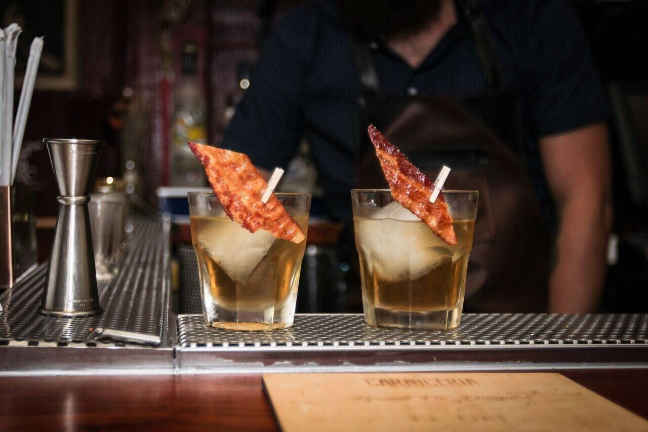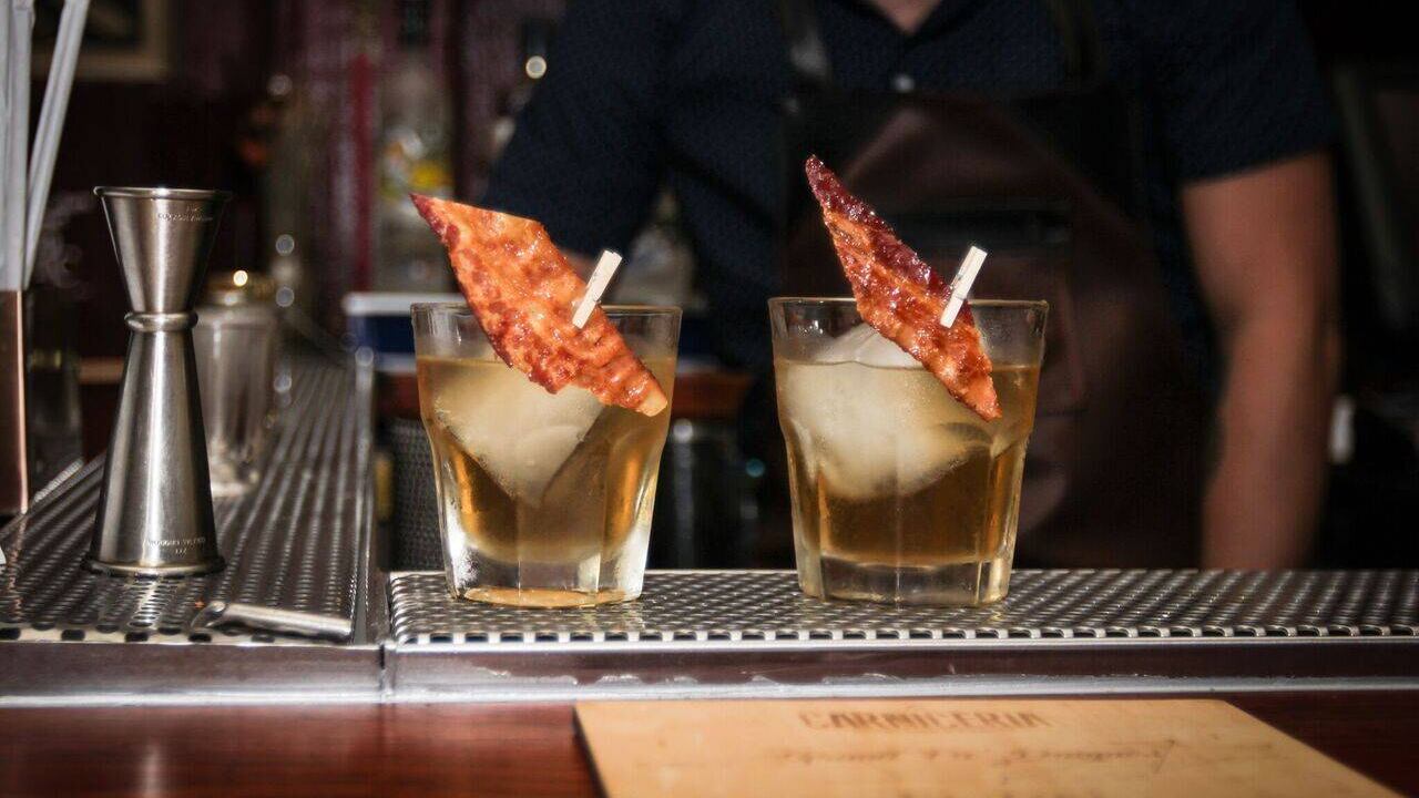 En un vaso se vierten todos los ingredientes. La tocineta se sofríe y luego pasa a un deshidratador de alimentos con miel y cayene pepper. Se sirve a las rocas.