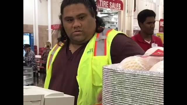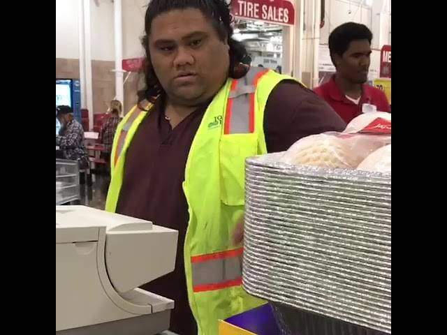 Lejos de molestarse por la situación, el hombre que se desempeña como cajero del local comercial, en Estados Unidos, les dice a las menores que se acerquen para que su madre las grabe junto a él.