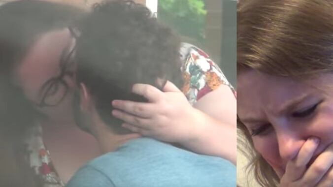 Pareciendo feliz con su respuesta, la mujer le da un beso en los labios antes de irse.