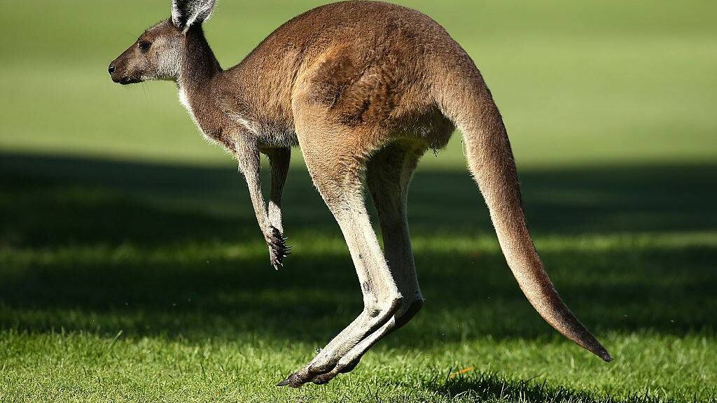 En el momento en que el canguro salta cerca de la joven, se da una vuelta en el aire para caer parado y seguir su recorrido.