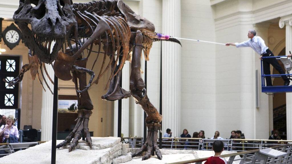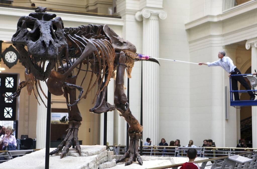 El Field Museum de Chicago comenzó a desmontar el lunes el esqueleto, apodado Sue. Equipos de trabajo se están preparando para mudarlo a una nueva sala de exhibición y traer un modelo de yeso de un dinosaurio aún más grande en su lugar.