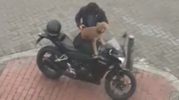En el registro, que ocurrió en Bogotá (Colombia), se ve que un moticiclista sube al can a su moto y lo acomoda en una bolsa especial para llevarlo en el vehículo.