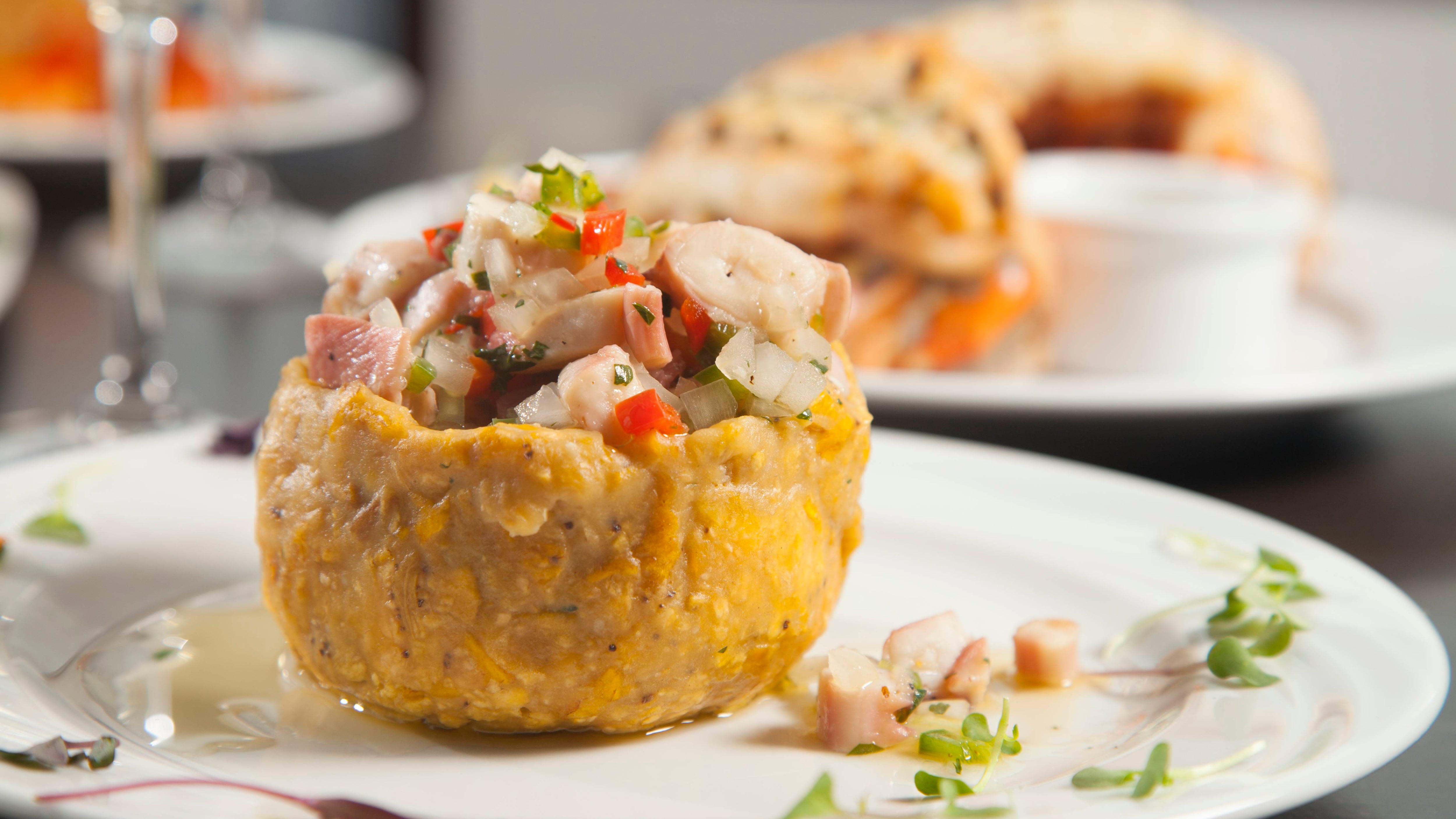 De entrada, se sugieren las sabrosas croquetas de bacalao sobre un alioli de cilantro y chipotle; el ceviche con malanga chips; los pinchitos de churrasco en salsa teriyaki; o los tacos de langosta.