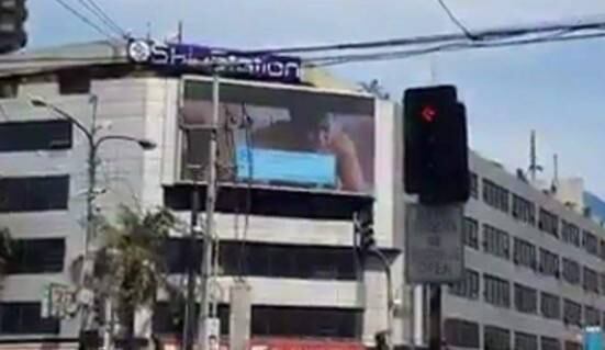 A las 2 de la tarde en punto, el video apareció en una pantalla gigante de publicidad y conmocionó a los automovilistas que no dudaron en capturar el momento.