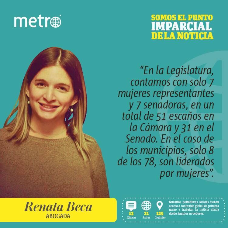 En la Legislatura, contamos con solo 7 mujeres representantes y 7 senadoras, en un total de 51 escaños en la Cámara y 31 en el Senado. En el caso de los municipios, solo 8 de los 78, son liderados por mujeres. En el ejecutivo, a pesar de resaltar y distinguir a Jennifer González, quien es la primera mujer en ocupar la silla de comisionado residente y, actualmente, es la mujer con el cargo político más alto, la gran mayoría de los puestos son ocupados por hombres. Esto resulta irónico en un país donde según el censo de 2016, el 52.4 % de la población está compuesta por féminas. Es decir que, aunque las mujeres somos mayoría en la isla, apenas estamos representadas en el ámbito político.
