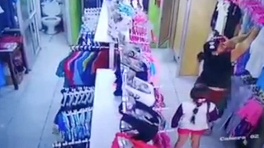 El video de 2 minutos y 53 segundos, grabado por la camara de seguridad del almacén, evidencia el actuar de una señora y la niña para sustrar prendas de vestir de la tienda de ropa.