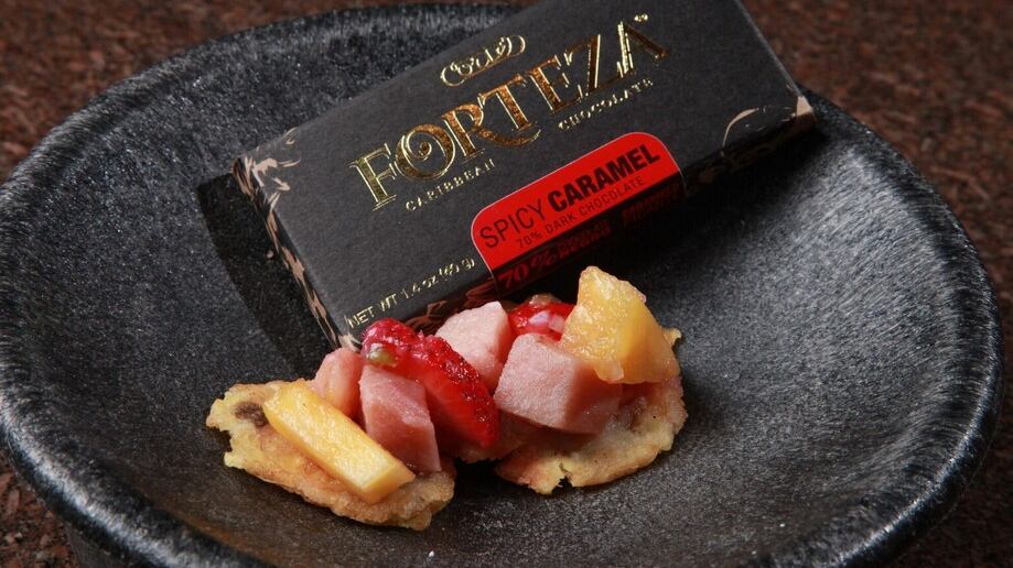 A manera de postre, fue servido un refrescante coctel de sandía helada, con limón y vodka. Maridado con el Forteza Spicy Caramel, un dark chocolate cuya concentración de cacao de 65% contrasta favorablemente con el sabor picante impartido por ajíes locales.