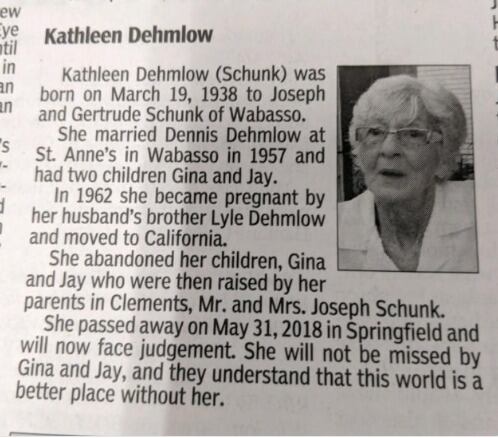 “Falleció el 31 de mayo de 2018 en Springfield y ahora enfrentará un juicio”, decía el obituario ahora eliminado. “No será extrañada por Gina y Jay, y entienden que este mundo es un lugar mejor sin ella”.