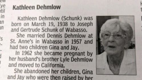 Los hermanos escribieron que Dehmlow los “abandonó” en 1962 cuando quedó embarazada y se mudó a California. Los padres de Dehmlow luego criaron a Dehmalo y su hermana.