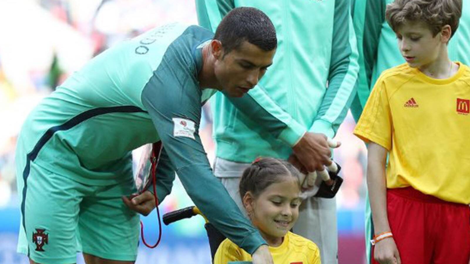 La niña rusa entró al campo de fútbol junto a Ronaldo en una silla de ruedas en la ceremonia previa al partido que disputaron Portugal y Rusia en el estadio del Spartak de Moscú de la pasada Copa Confederaciones.