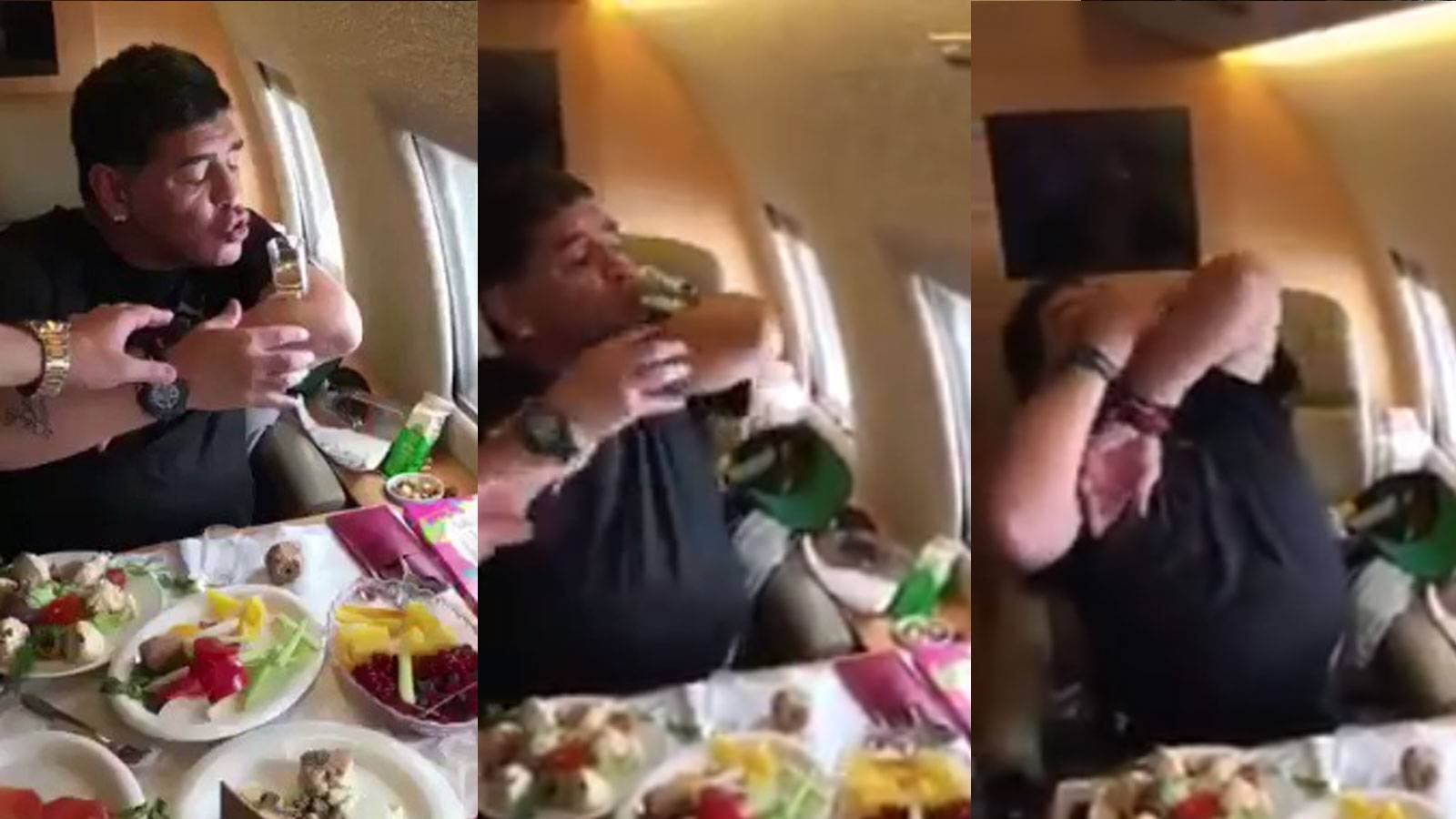 Un nuevo video del astro argentino nos muestra como en un jet privado, él desde su asiento disfruta de una cena bastante sustanciosa y algo pesada para una persona, sin embargo a pesar de esa cantidad de comida, decide tomarse un shot de tequila pero con su codo, una popular costumbre que pocos logran, pero que en este caso da continuidad a sus constantes abusos de alcohol.