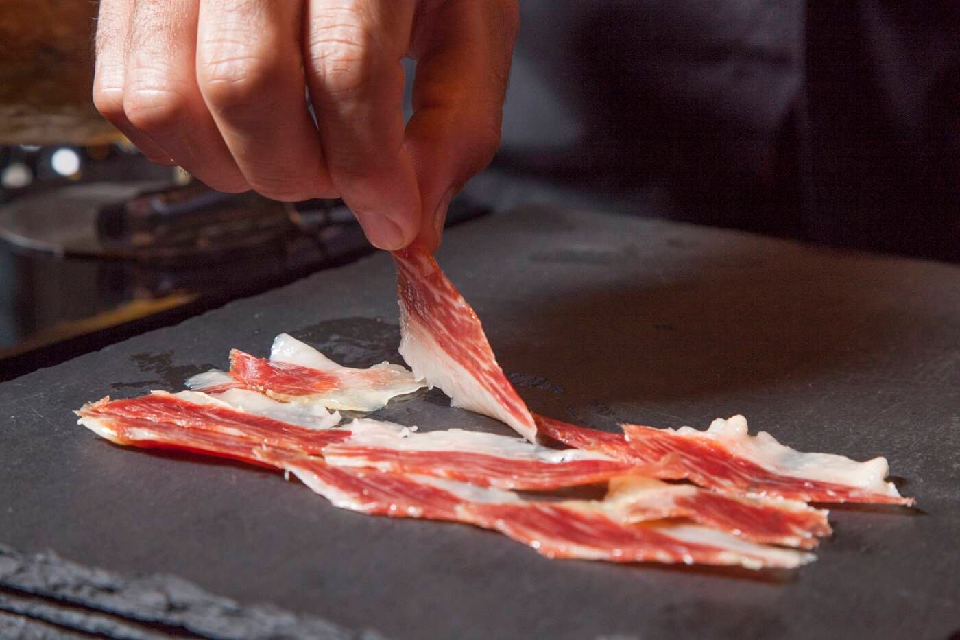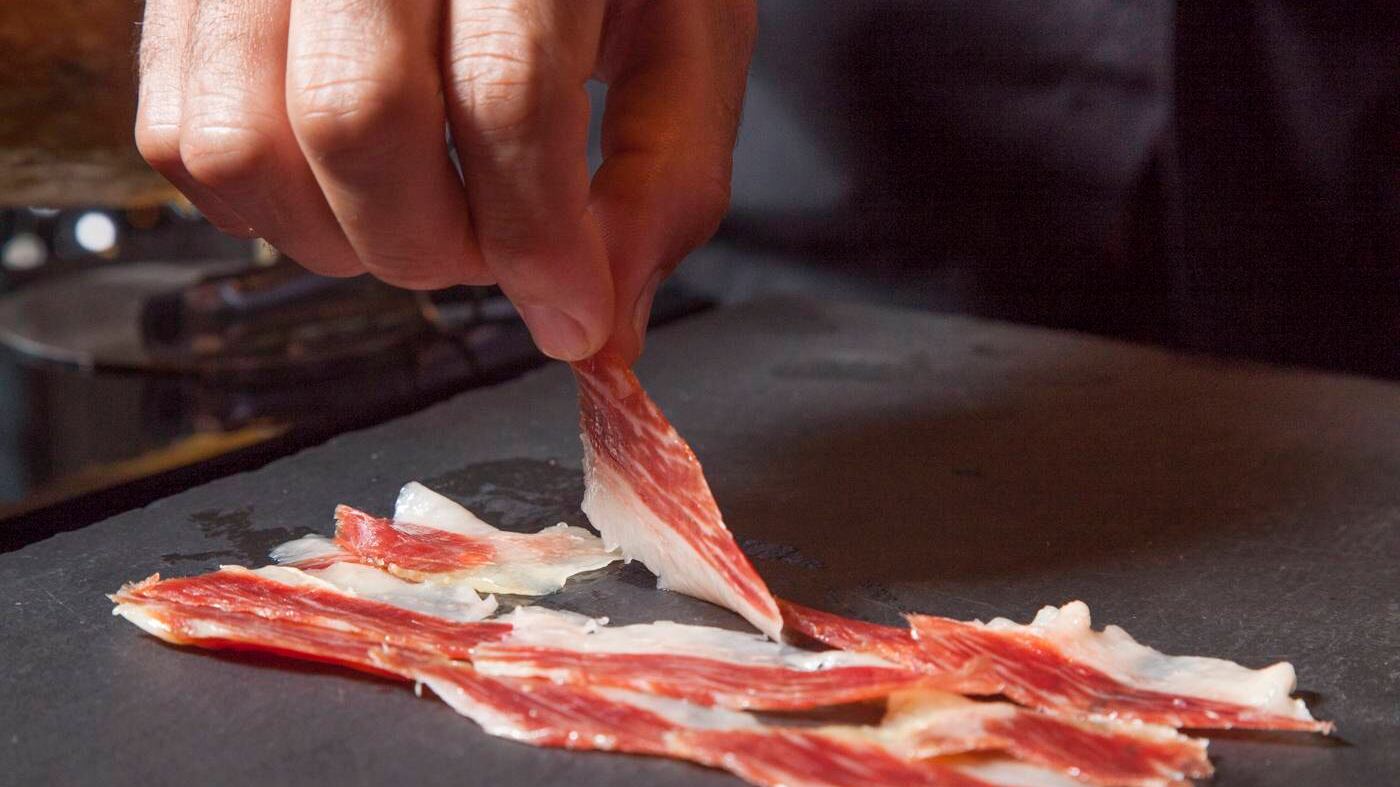 En cuanto a la forma de cortar correctamente el jamón, sugirió que la tapa no sea muy larga, debe ser tamaño de bocado y bien fina. De esta forma se verá el filo del cuchillo a través de la tapa.
