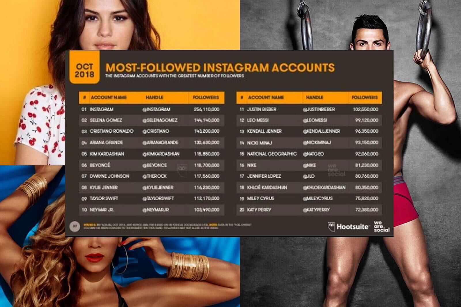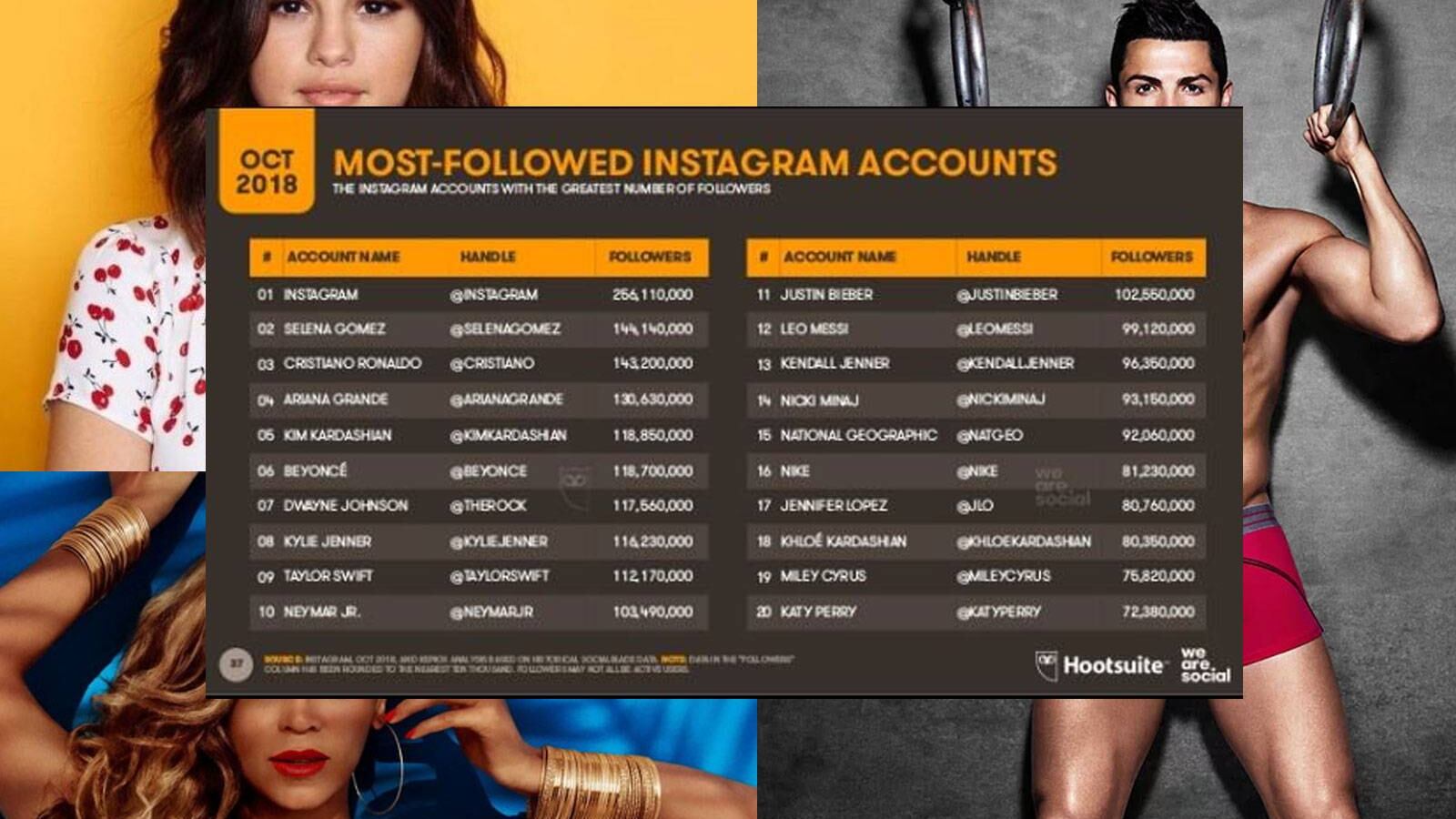 La primera posición con más seguidores la ocupa la cuenta de la propia red social Instagram que acumula más de 256 millones de seguidores. Le siguen en cantidad Selena Gomez (144 millones), Cristiano Ronaldo (143 millones), Ariana Grande (130 millones), Kim Kardashian (118.7 millones), Beyoncé (118.5 millones) y Dwayne Johnson (117 millones).