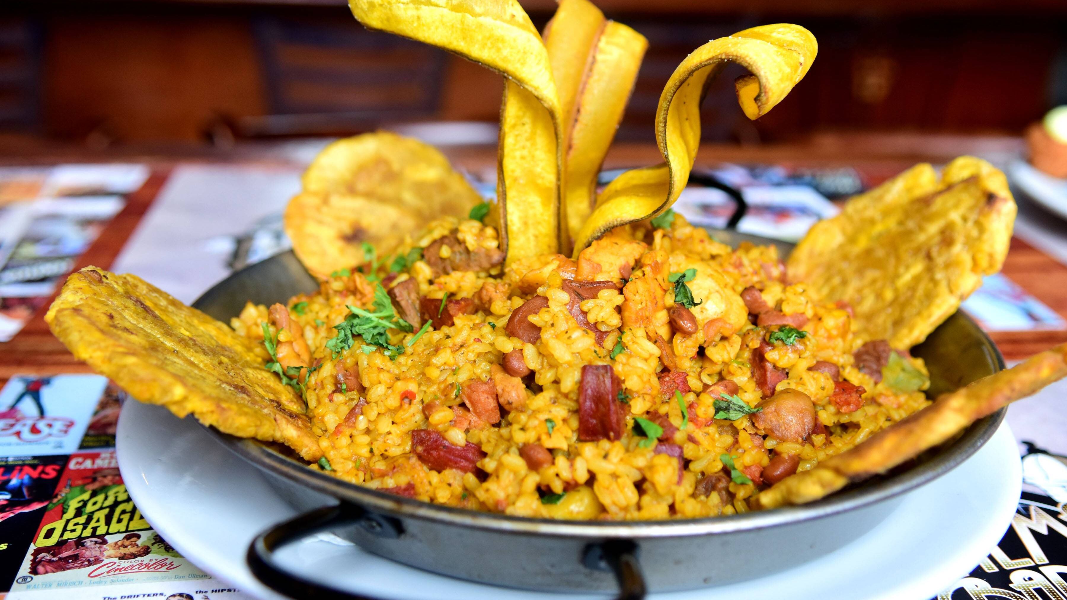 Uno de los platos más ovacionados es el arroz campo, una versión paella criolla, que se confecciona con longaniza artesanal, churrasco y pollo; y el surtido jíbaro, que trae tostones rellenos de ceviche, bolitas de mofongo, croquetas de queso manchego con jamón serrano, longaniza y tacos de pescado.