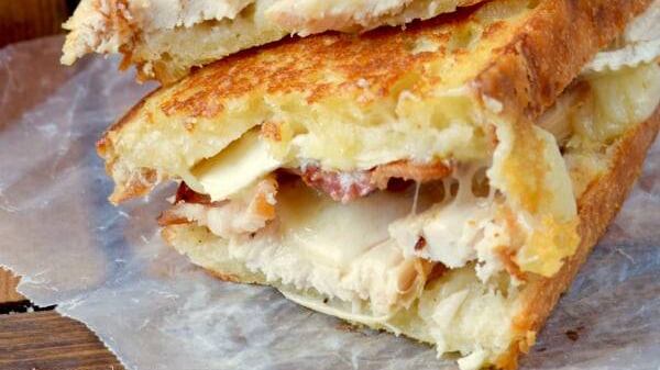 En un recipiente pequeño combina mayonesa con ajo. Una vez listo, toma dos pedazos de pan y coloca mayonesa, queso, pavo y tocineta. Cierra el emparedado, mientras calientas a fuego medio una sartén.