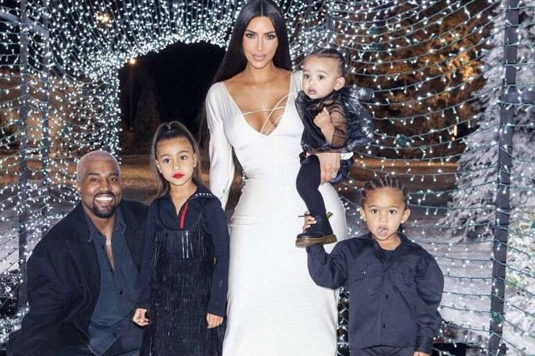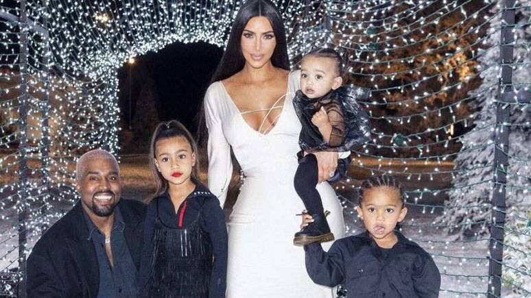 La mama de tres, North, Chicago y Saint, publicó varias fotografías de la familia en un fondo navideño luciendo unos atuendos acorde a la fecha, con Kim en un vestido blanco de manga larga que llegaba al piso. El fondo de la foto está adornado con árboles de navidad de cinco pies cubiertos de nieve.
