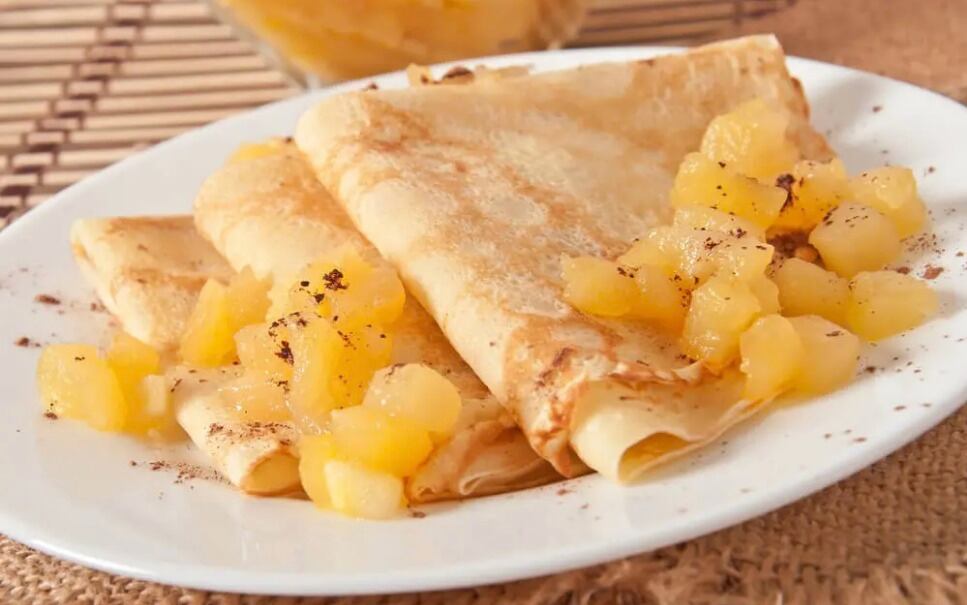 Primero, bate los huevos, la harina, la sal, la mantequilla y la leche en un bol hasta conseguir una mezclas homogénea. A continuación, añade unas gotas de aceite en una sartén caliente. Vierte un poco de la mezcla y extiéndela bien. Cuando empiece a cuajar, dale la vuelta. Pela y trocea las manzanas. Caliéntalas en el microondas 10 minutos hasta que se cuezan. Seguidamente, añade miel a la compota (si lo deseas). Rellena los crepes con las manzanas y enróllalos a gusto.