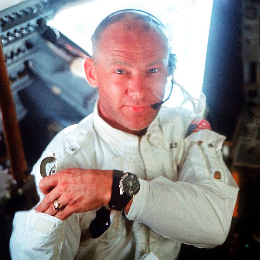 El Speedmaster de oro de Omega es una versión de los relojes que la compañía les regaló a los astronautas en una cena de gala en 1969. Por un precio relativamente modesto de 9.650 dólares, el reloj de acero inoxidable tiene una imagen grabada a láser de Aldrin descendiendo del módulo lunar.