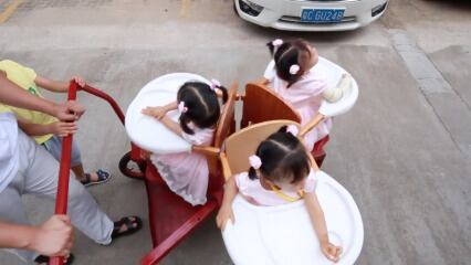 Un creativo padre en la ciudad china de Zhuhai ha inventado un carrito giratorio para sus hijas trillizas, como muestran las imágenes grabadas el martes.