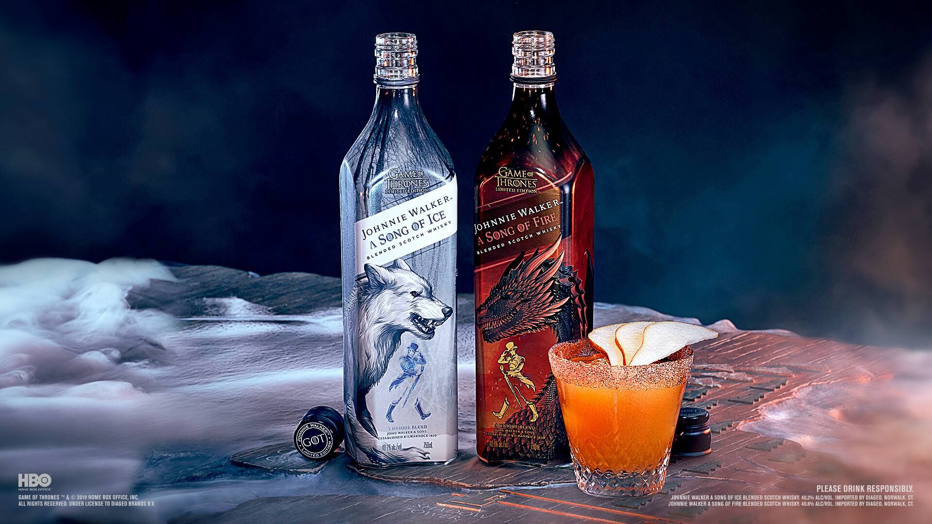 De la familia de Stark viene A Song of Ice, de la familia de Targaryen, A Song of Fire. Juntos, los dos whiskies celebran la relación dinámica entre las casas, representada por los guardianes de cada familia, el lobo y el dragón, que adornan ferozmente cada botella. Como otra pista más a las complicadas interacciones entre las dos grandes familias en la historia del programa, el icónico caminante de Johnnie Walker inusualmente mira hacia atrás en la botella de A Song of Fire, revelando un enfrentamiento con el caminante en la botella de A Song of Ice, cuando se ponen una al lado de la otra.