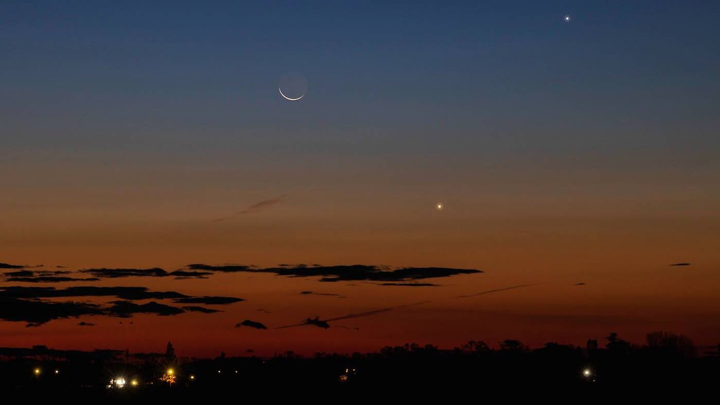 Aunque lucirán cercanos entre sí, Venus se encuentra hoy a 136 millones de millas (219 millones de km) de la Tierra, mientras que Júpiter está a 568 millones de millas (914 millones de km) de nuestro planeta.