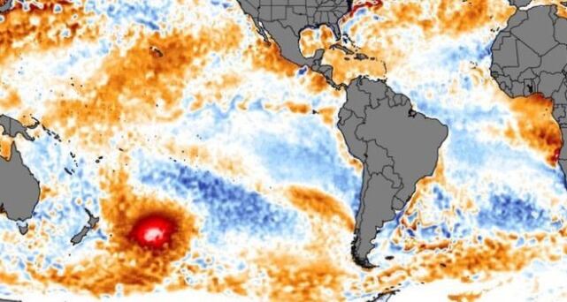Una gigantesca masa de agua caliente, con temperatura superior al promedio, fue detectada por satélites al este de Nueva Zelanda en pleno océano Pacífica.