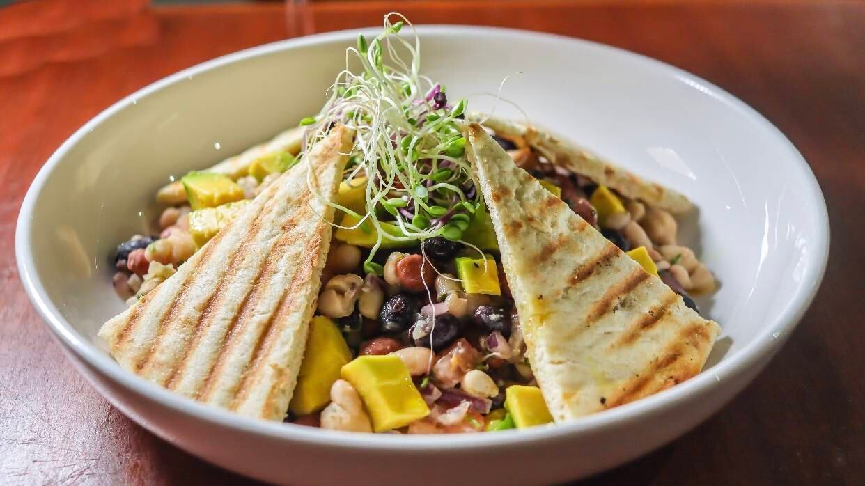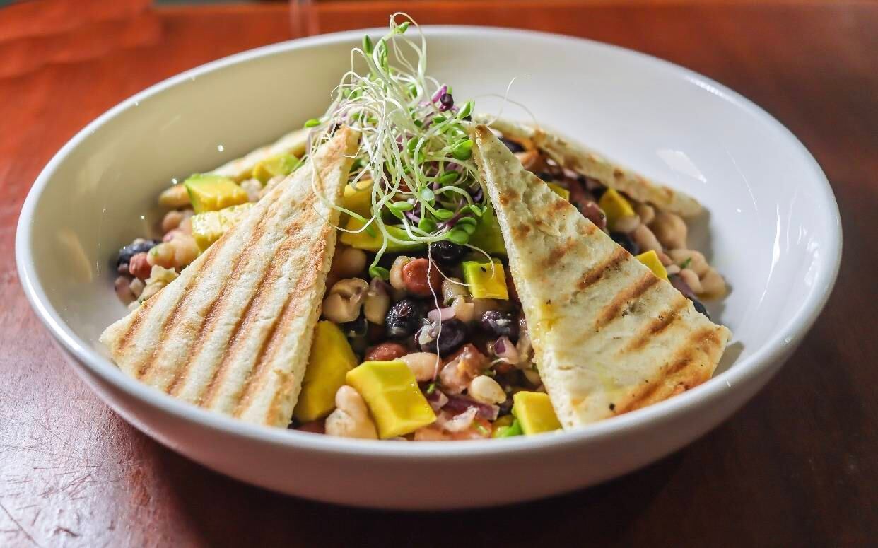 Otra refrescante opción para los vegetarianos es la ensalada de granos con pan pita, la cual incluye coles de bruselas, zanahoria, maíz y microgerminados. Del mismo modo, esta ensalada se puede acompañar con alguna proteína, como salmón, camarones, setas o con pollo. La ensalada también se puede ordenar en forma de wrap y se acompaña con chips de malanga frescos hechos en la casa.