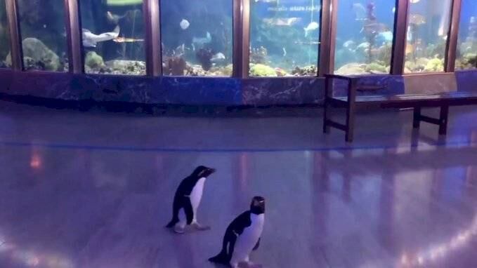 Pareja de pingüinos se pasea por acuario cerrado tras coronavirus