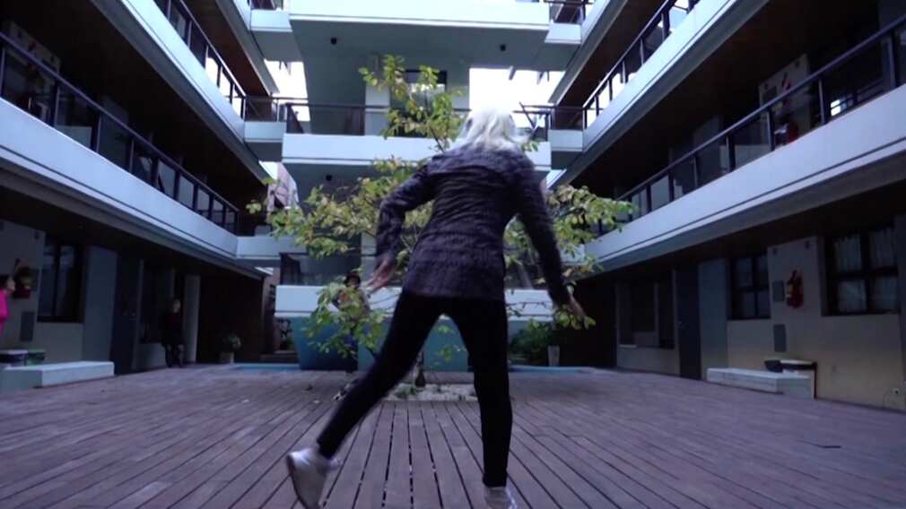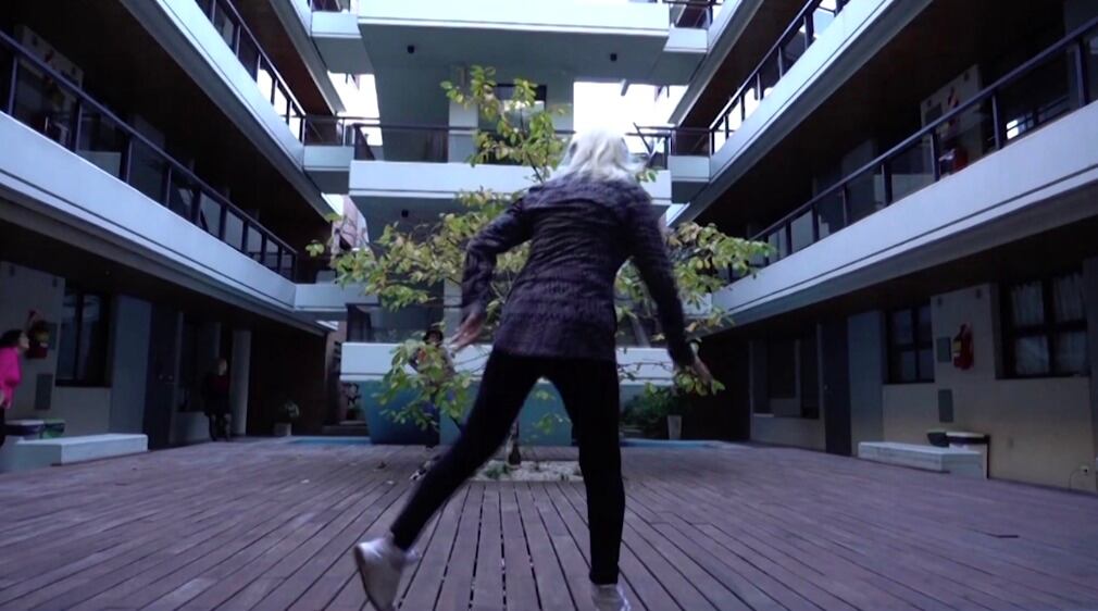 El edificio reúne las condiciones perfectas para que puedan moverse mientras observan a la profesora. Tiene un gran patio central abajo -donde Mogilevsky se sitúa- y cuatro pisos que lo rodean con balcones amplios y suficiente profundidad para avanzar y retroceder.