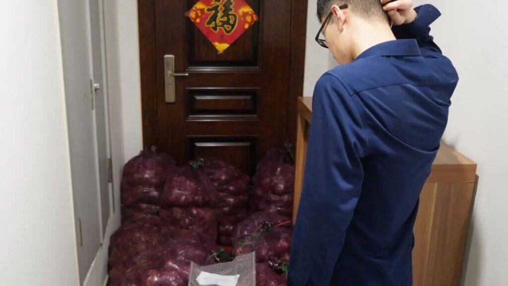 Las imágenes de las redes sociales mostraron a un conductor de reparto con un camión cargado con los tubérculos en un complejo residencial en Zibo, Shandong, en el este de China, mientras intentaba ponerse en contacto con el novio.