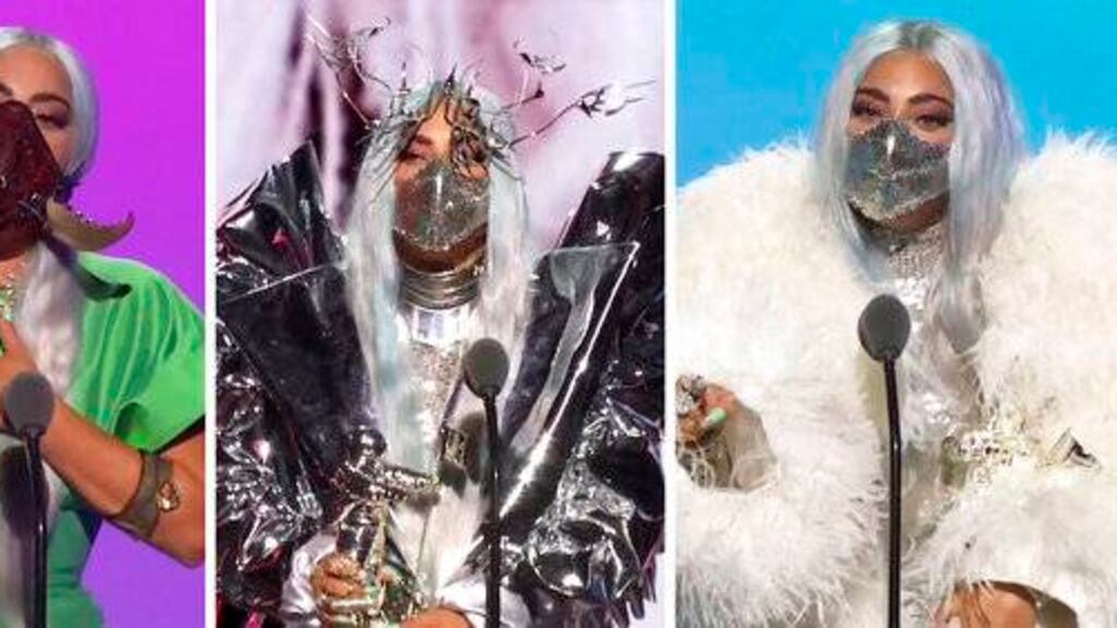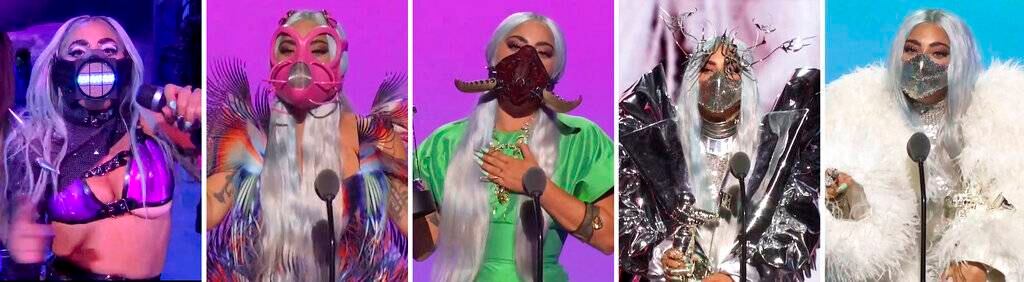 Gaga lució un tapabocas rosado amarrado alrededor de la cabeza, uno con colmillos puntiagudos e incluso uno con pantalla electrónica mientras cantaba “Rain on Me” con Grande, que también usó una mascarilla negra. Gaga recibió el premio a la artista del año en un abrigo de tul y organdí de Valentino y una mascarilla plateada que le hacía juego.