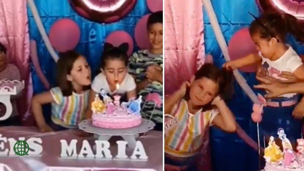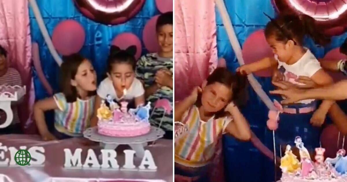 Todo ocurrió mientras le estaban cantando el cumpleaños a la pequeña que se encuentra en el centro del video, en el momento en que la vela debe ser apagada, su maldadosa hermana se abalanzó y la apagó primero.