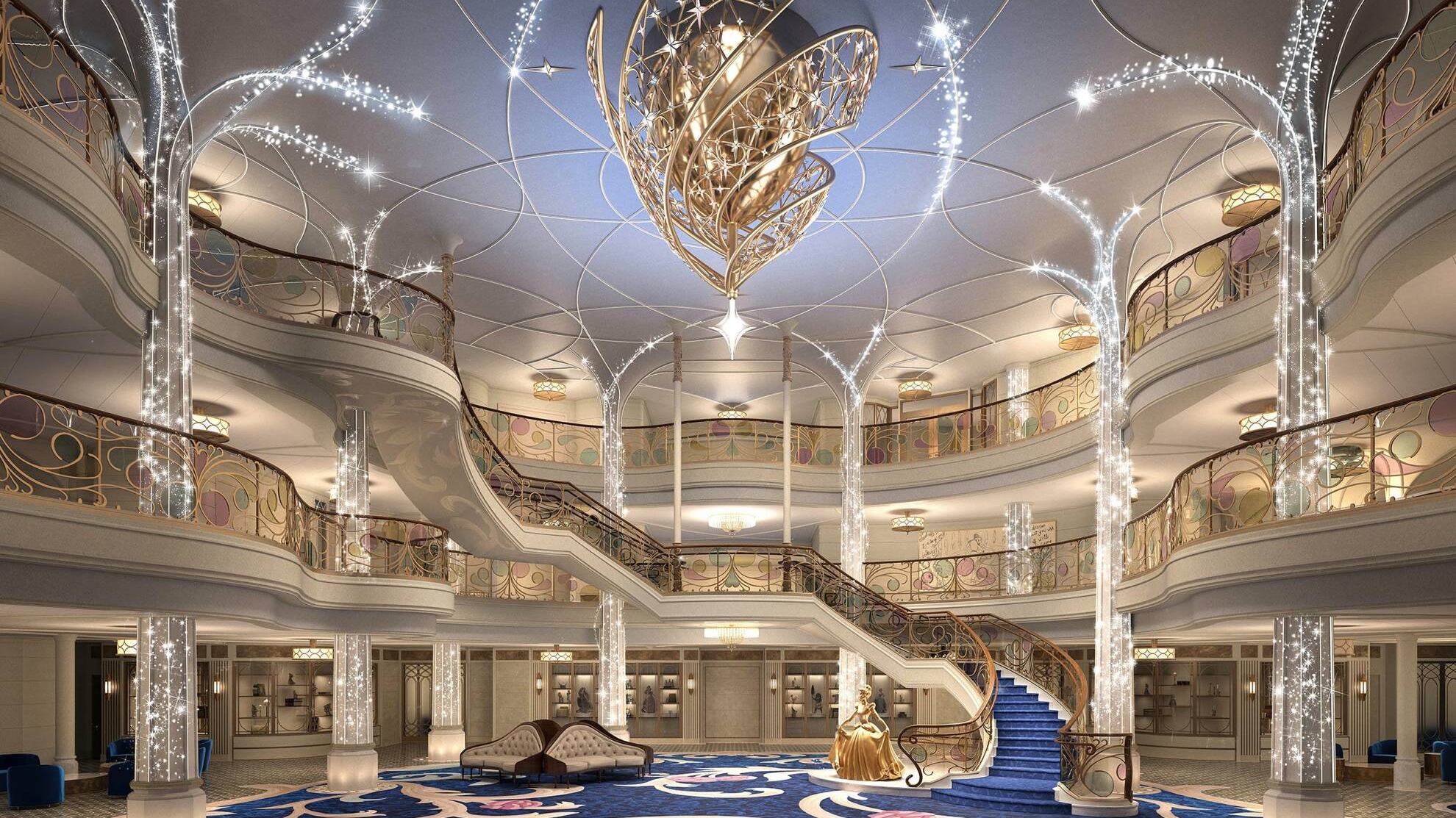 El fascinante Gran Salón, un espacio luminoso, aireado y elegante que dará la bienvenida a los huéspedes cuando suban a bordo, es la puesta más fuerte al encanto. Es un atrio inspirado en un castillo de cuento de hadas decorado con influencias góticas, barrocas y rococó francesas. El Gran Salón será el castillo de Disney Cruise Line en los mares, un reino encantado donde relucientes senderos de polvo de duendes trepan majestuosas columnas de tres pisos, se derraman por el techo y animan la reluciente lámpara de araña con un efusivo estallido de magia. El candelabro es la manifestación de los deseos hechos realidad: una espiral giratoria de gemas de cristal salpicadas de luz. En la base de una gran escalera, estará la Cenicienta. La hermosa estatua de bronce de la princesa es solo uno de los muchos homenajes a su historia en el diseño del Gran Salón. Este atrio será la puerta de entrada encantada a todo lo que ofrece el Disney Wish.