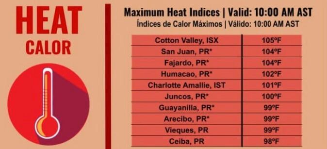 El Servicio Nacional de Meteorología (SNM) en San Juan informó a eso de las 10:00 de la mañana que el índice de calor para San Juan alcanzó los 104 grados Fahrenheit.