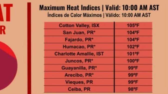Asimismo, en Fajardo se registraron temperaturas de 104 grados, 102 grados para Humacao y 100 grados para la zona de Juncos.