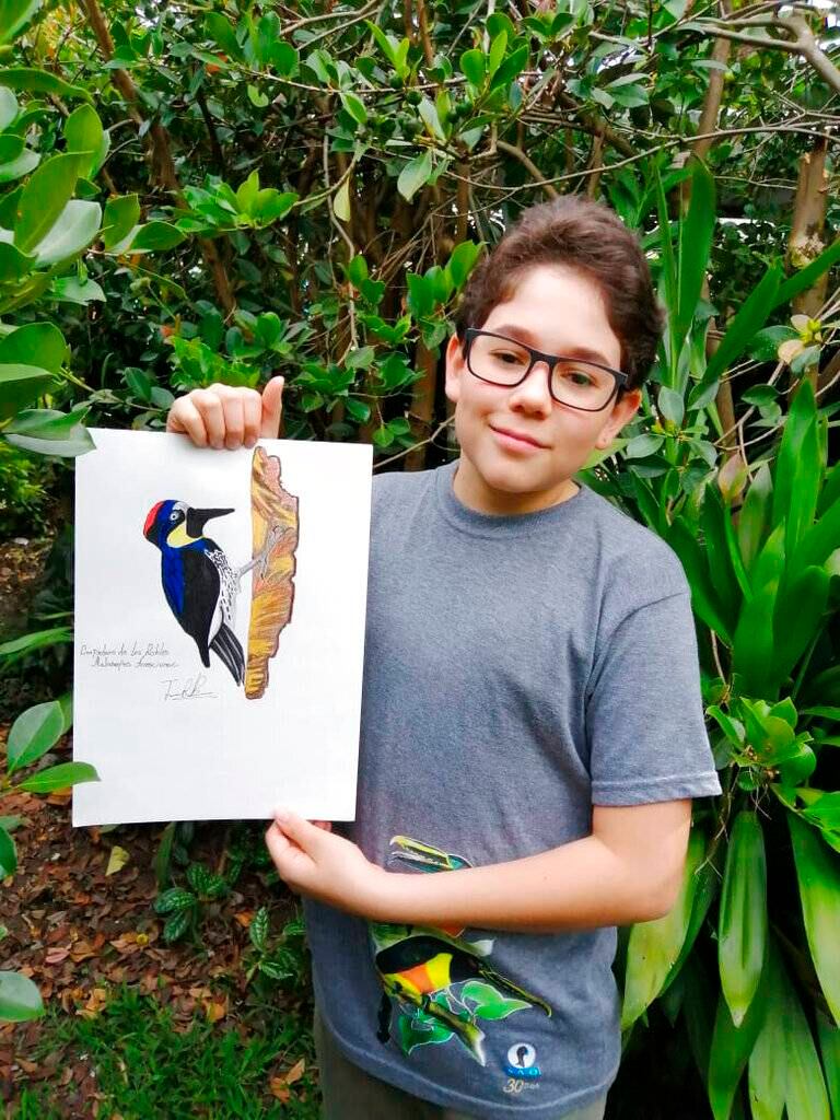 Rendón dice que conoce a decenas de aves por su nombre y que lleva tiempo dibujándolas después de la escuela. En una entrevista virtual con video, usó los nombres científicos de varias de ellas y mostró algunas de sus ilustraciones favoritas, incluida la que abre su guía —de una tangara flamígera— y otra de un gavilán.