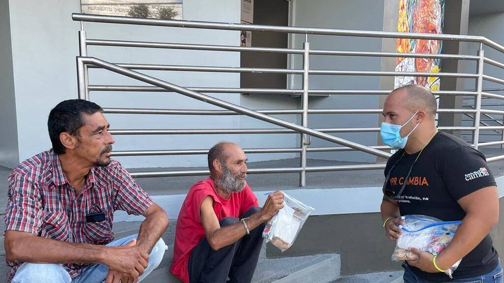Sobre 25 jóvenes de la organización Puerto Rico Cambia se lanzaron hoy a la calle desde las 9 de la mañana, hasta el mediodía, para darles desayuno a personas sin hogar.
