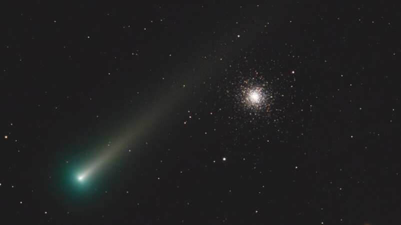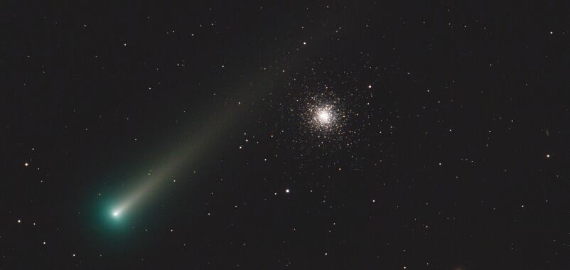 Raymond Negrón, uno de los astrofotografos de la SAC, captó hoy una espectacular imagen en la que se aprecia al cometa Leonard mientras pasaba casi frente a “Messier 3”, una agrupación estelar que por tener la forma de una esfera de muchas estrellas, se le conoce como un cúmulo globular.