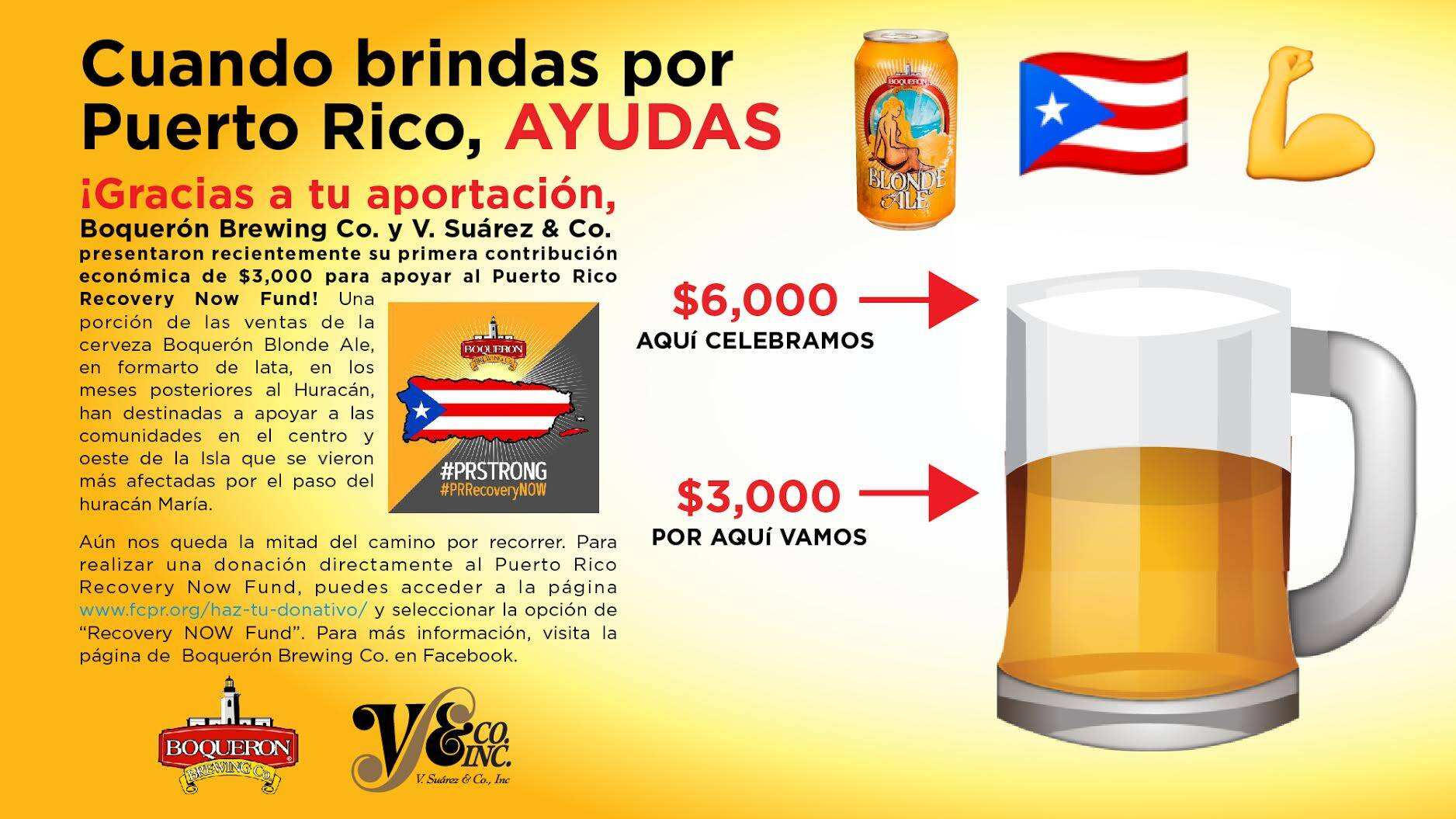 “Nos sentimos muy complacidos de aportar a una iniciativa que impulsa la recuperación de nuestra comunidad. Agradecemos a nuestros consumidores y a V. Suárez por su participación en este esfuerzo y nos comprometemos a seguir colaborando hasta lograr nuestra meta.” expresó Juan Carlos Torres, homebrewer de Boquerón Brewing Co.