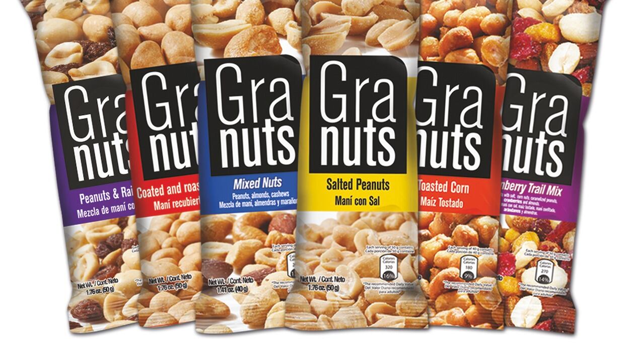 Granuts cuenta con una buena variedad que incluye maní con sal, maní con pasas y mezcla de nueces que incluye maní, almendras y cashews. También tiene el conocido “trail mix” que mezcla nueces con deliciosa fruta seca, el maní japonés, que es maní horneado, “corn nuts” o maíz tostado, y honey roasted.
