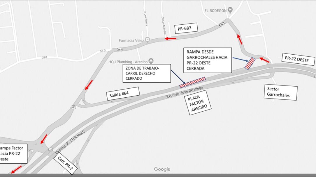 También, estaremos cerrando la rampa de acceso desde la comunidad de Garrochales hacia la PR-22 Oeste. Habrá una ruta de desvío para estos usuarios que quieran acceder la PR-22 en esta dirección según se describe en el mapa adjunto.