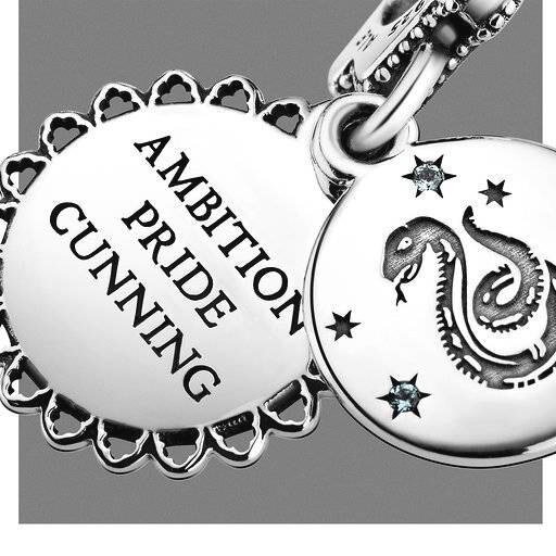 Todas las casas de Hogwarts están representadas en dijes colgantes de plata esterlina de dos dimensiones con detalles que sorprenderán a los fanáticos, como un disco emblemático rodeado de piedras en los colores de cada una de las casas. En la parte posterior los bordes están detallados con almenas en referencia al estilo arquitectónico del castillo.