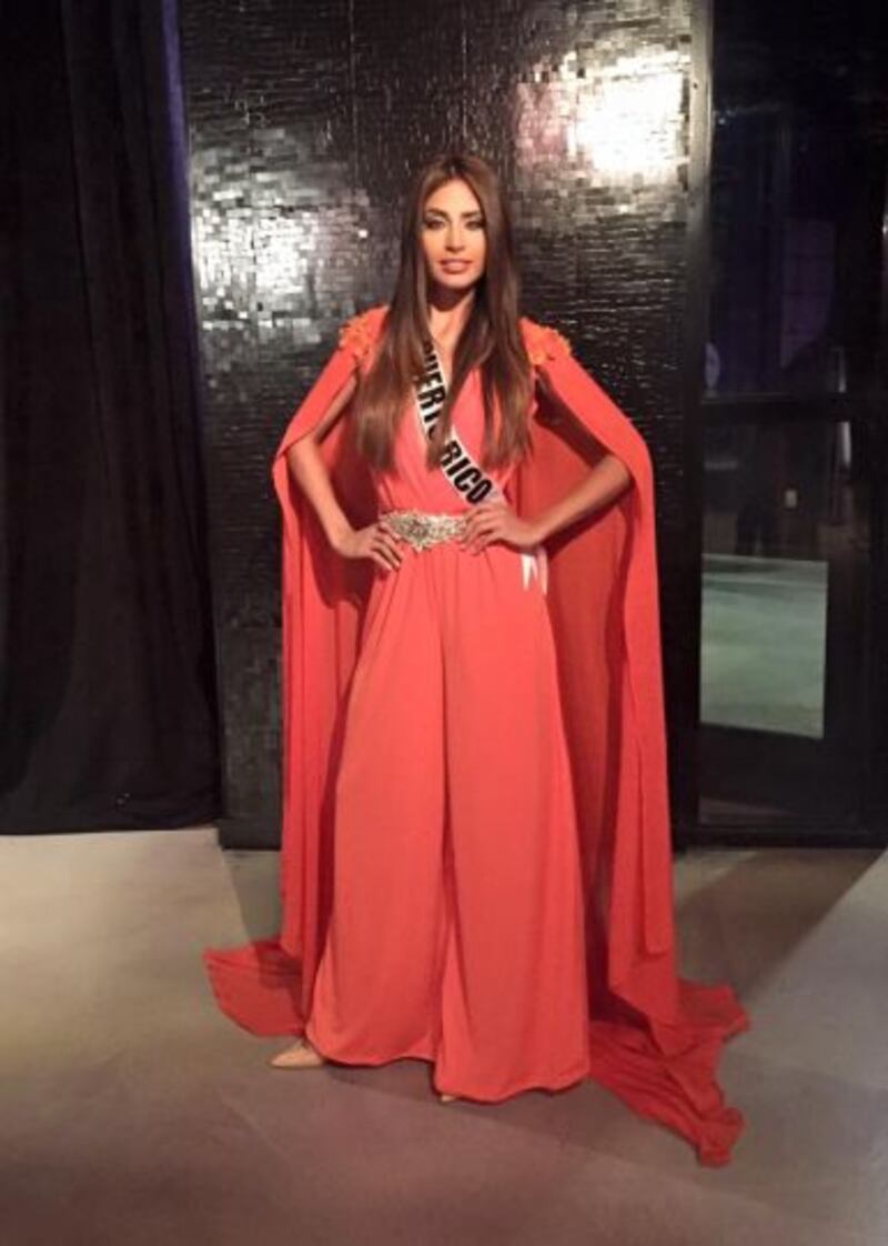La beldad local lució un vestido tipo ‘jumpsuit’ color anaranjado del diseñador puertorriqueño Juan Carlos Collazo y el cinturón del mismo fue confeccionado por Marcos Carrazana, quien fue el encargado de realizar el traje que llevará Catalina en la preliminar y final del certamen.