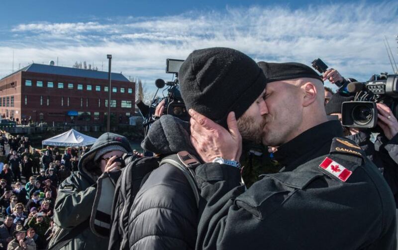 Francis Legare y Corey Vautour hicieron historia en la Marina Real canadiense tras ser la primera pareja gay en protagonizar el tradicional beso de regreso a casa.