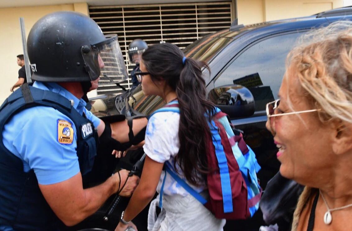 El choque entre policías y estudiantes se dio en momentos en que miembros de la Uniformada escoltaban los vehículos oficiales del presidente del Senado, Thomas Rivera Schatz, al momento de su salida del Centro de Puerto Rico, lugar donde acudió en horas de la tarde para conocer la labor del centro comunitario.